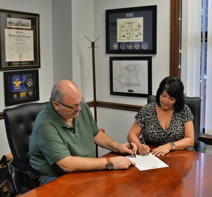 Jeffery Langston, AFGE 1592 Local Union president, and Michelle Hathaway, Ogden Air Logistics Complex vice director, sign the OO-ALC VPP Commitment Agreement. The agreement renewed the OO-ALC’s commitment to promote employee empowerment, quality of life, increased work quality and efficiencies, and
