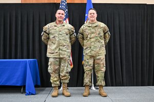 Chief Master Sgt. (select) Christian Suarez, 34th Fighter Generation Squadron, and Chief Master Sgt. (select) Leondas Moore, 388th Maintenance Squadron, pose for a photo before celebrating their promotion to chief master sergeant Dec. 1, 2022, at Hill Air Force Base, Utah. The Air Force announced