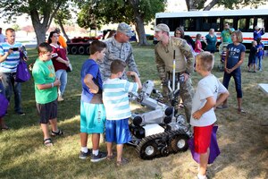 HILL AIR FORCE BASE, Utah – Staff Sgt. Kyle Preece and Staff Sgt. Aaron Jarman, explosive ordnance disposal team members, demonstrate an EOD robot during “National Night Out” in Perry, Utah, Aug. 1. The 419th Fighter Wing sent three Airmen to represent the Air Force Reserve at the event, which