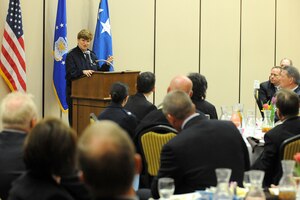 Gen. Janet C. Wolfenbarger, commander of Air Force Materiel Command, addresses the Hill Air Force Base, Utah, community leaders luncheon during her trip here April 17. Wolfenbarger also visited many areas of the base and learned about Team Hill and its vital role to the warfighter.