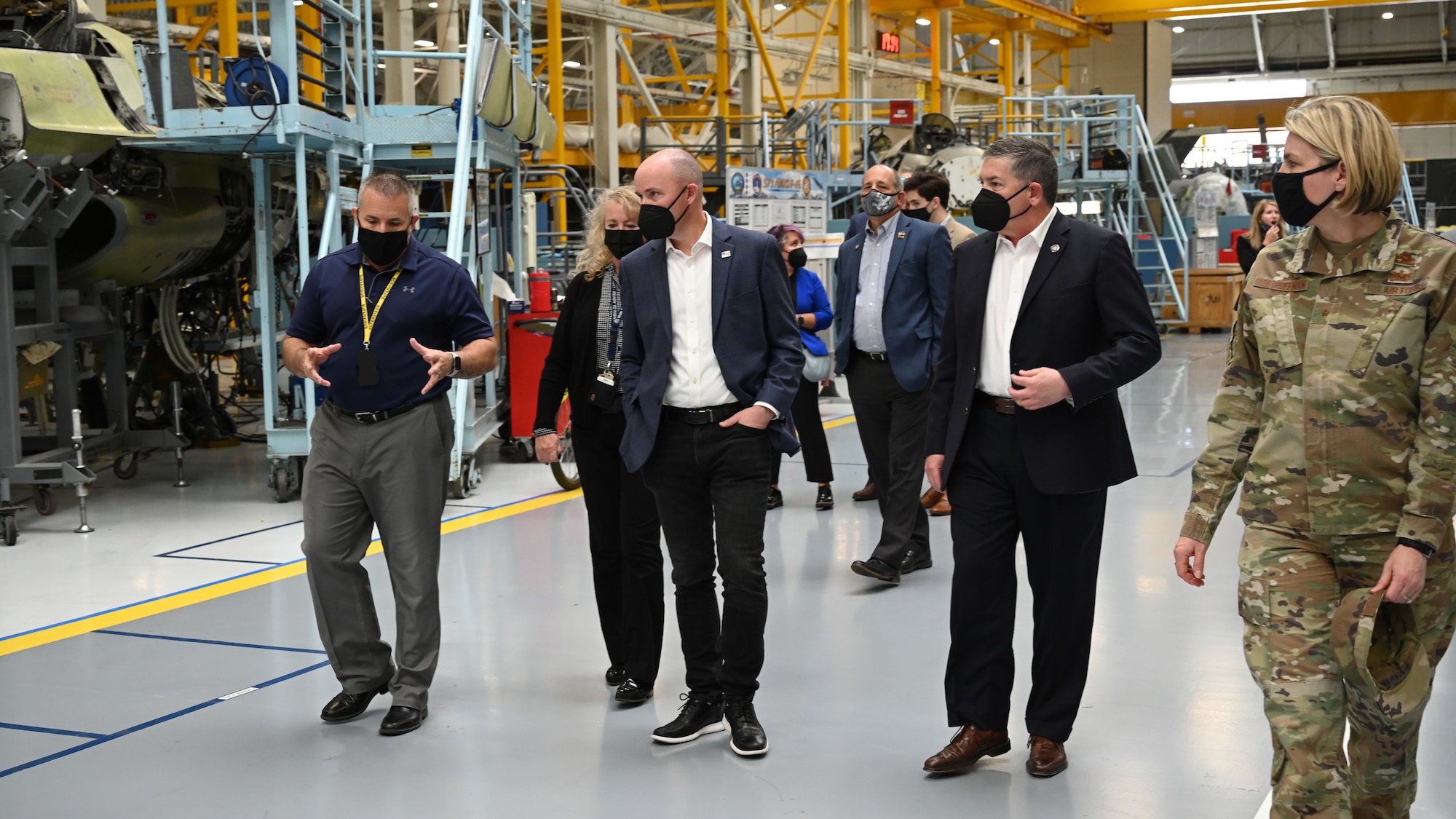 Brig. Gen. Cauley von Hoffman, Ogden Air Logisitic Complex commander, greets Utah Gov. Spencer Cox during a tour of Hill Air Force Base, Utah, May 5, 2021. The tour provided the governor an overview of missions performed at Hill. (U.S. Air Force photo by R. Nial Bradshaw)