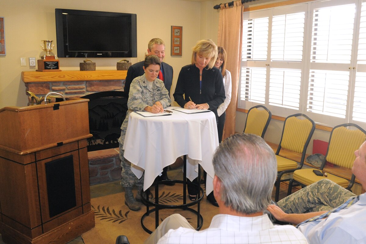 Col. Kathryn Kolbe, 75th Air Base Wing commander, and Barbara Riddle, Davis Area Convention & Visitor's Bureau CEO and president, sign an agreement Aug. 26 coordinating lodging opportunities between Hill Air Force Base and surrounding visitor's bureaus. Waiting to sign the agreement are Christian Peale, Hill's lodging manager, and Sara Tolliver, Ogden-Weber Convention & Visitor's Bureau CEO and president. (U.S. Air Force photo by Todd Cromar/Released)